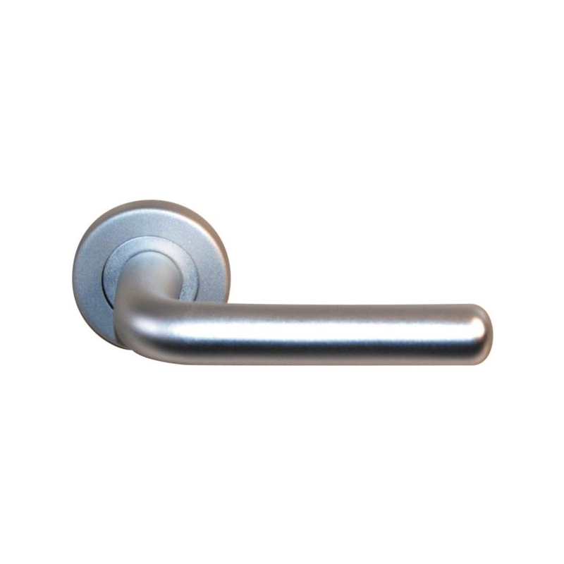Pour porte intérieure d'épaisseur de 40 à 50 mm. Béquille avec un retour coudé en L. Dimension rosaces : Ø 50 mm Épaisseur : 7 mm Longueur béquille : 115 mm Saillie de la béquille : 60 mm Fouillot carré : 7 mm Matière : aluminium Finition : Naturel perlé Conditionnement : boite 80% recyclable.