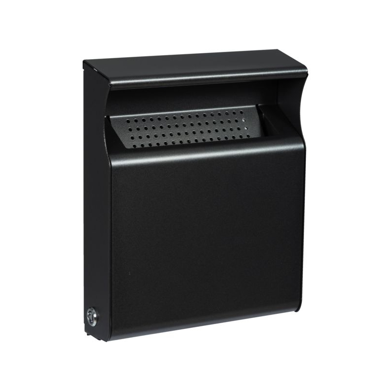 En acier électro-zingué poudré polyester gris manganèse (intérieur et extérieur), fixation murale en 4 points et tôle renforcée. Fermeture par clé triangulaire. Protection contre les intempéries. Vidage simple par décrochage et retournement du bac. Autocollant cigarette fourni.