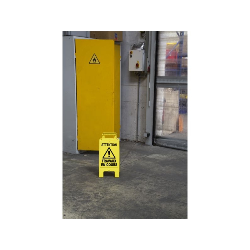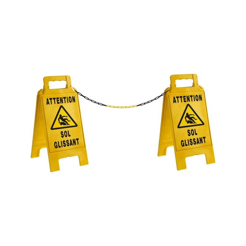 En polypropylène avec renforts de maintien. Utilisation temporaire intérieure et extérieure. Poignée ergonomique, large surface d'impression. Clip de maintien en position ouverte, grande stabilité. Crochets pour chaîne de signalisation. H x l : 600 x 275 mm Épaisseur (plié) : 23 mm