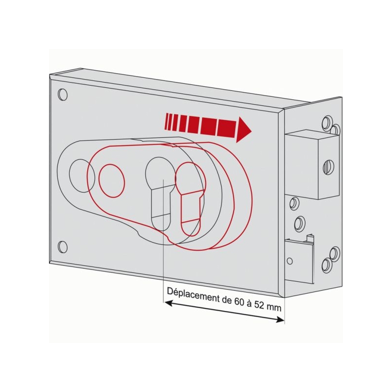 Course des pênes ½ tour et dormant réglable. Retournement possible tirant/poussant sans démontage. Livré avec gâche, sans cylindre. Coffre : 140 x 88 mm Axe : 52 à 60 mm Entraxe : 109 à 117 mm Fouillot carré : 7 mm Finition : noir Conditionnement : boite