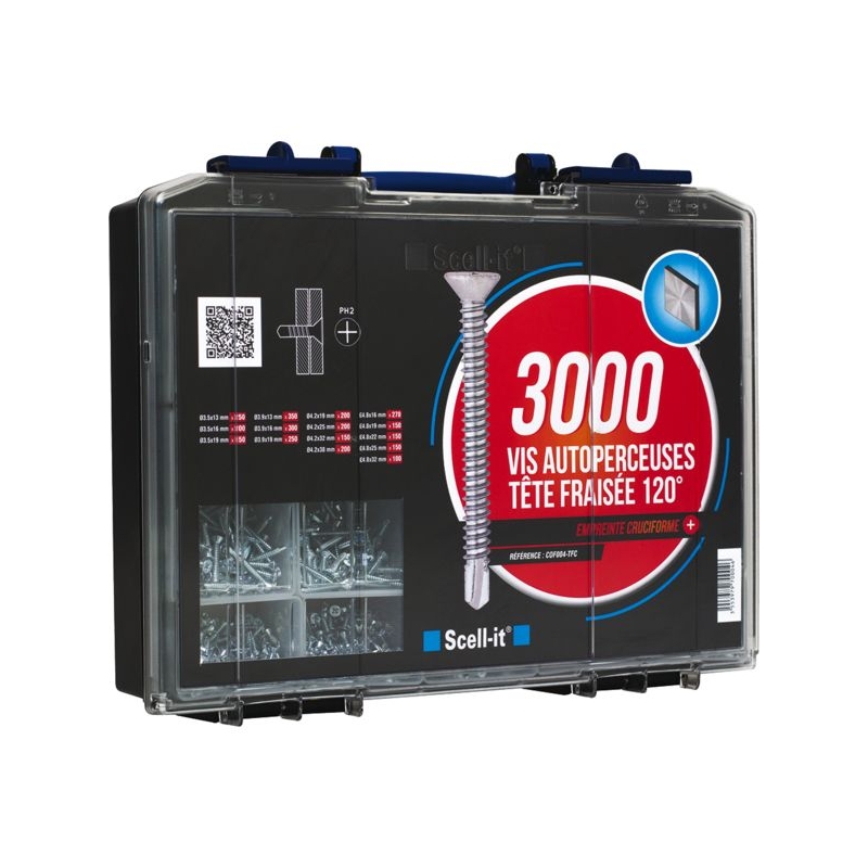 Tête fraisée, empreinte cruciforme. Acier zingué. Filetage total. Composé de 3000 vis autoperceuses : - Ø 3,5 x 13 mm (250 pièces), - Ø 3,5 x 16 mm (200 pièces), - Ø 3,5 x 19 mm (150 pièces), - Ø 3,9 x 13 mm (350 pièces), - Ø 3,9 x 16 mm (300 pièces), - Ø 3,9 x 19 mm (250 pièces), - Ø 4,2 x 19 mm (200 pièces), - Ø 4,2 x 25 mm (200 pièces), - Ø 4,2 x 32 mm (130 pièces), - Ø 4,2 x 38 mm (150 pièces), - Ø 4,8 x 16 mm (270 pièces), - Ø 4,8 x 19 mm (150 pièces), - Ø 4,8 x 22 mm (150 pièces), - Ø 4,8 x 25 mm (150 pièces), - Ø 4,8 x 32 mm (100 pièces).