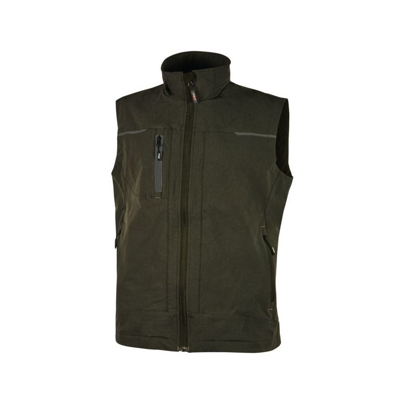 90% nylon 10% élasthanne, 260 g/m². Tissu stretch, confortable, souple sur la peau, hydrofuge, respirant et qui sèche rapidement. 2 poches à l'avant et une poche pour téléphone portable sur la poitrine avec zip, 2 grandes poches intérieures. Coloris : noir/jaune, marine/orange Taille : M à 2XL