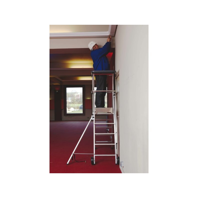 Utilisation sur sol plat. Usage ultra-intensif. En aluminium. Garde-corps 360° avec portillon semi-automatique rigide. Montants de 70 mm renforcés. Plate-forme anti-dérapante 600 x 420 mm avec plinthes intégrées. Marches striées antidérapantes de 80 mm. Tablette porte-outils intégrée. 2 roulettes Ø 160 mm pour les déplacements. Sabots antidérapants haute sécurité. Stabilisateurs à mise en place automatiques. Anneaux de grutage. Charge maxi. : 150 kg 3 à 6 marches : norme PIRL NFP 93353 - EN 131-7 - Décret 2004.924 7 à 8 marches : norme PIRL NFP 93352 - EN 131-7 - Décret 2004.924