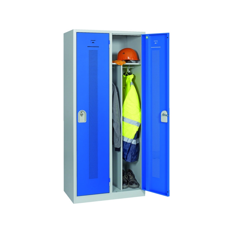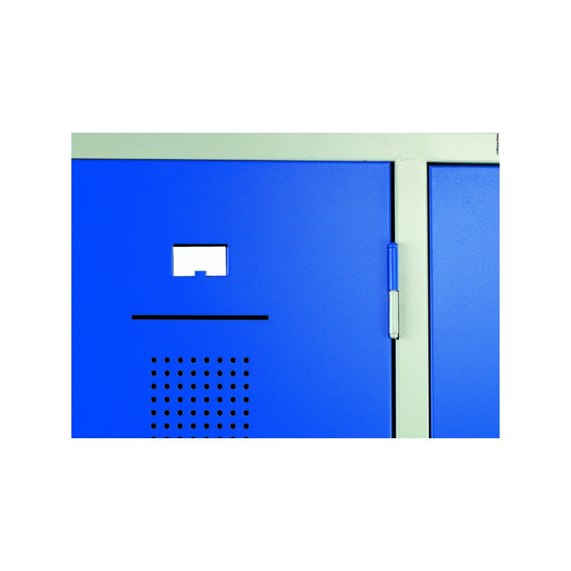 Porte renforcée par un raidisseur vertical, aérations. Porte-étiquettes, tringles portes cintres avec crochets, fente courrier et fermeture encastrée par moraillon débrayable porte-cadenas (serrure à clé en option). Hauteur sur socle : 1800 mm Profondeur : 500 mm Coloris : corps gris, porte bleue Option disponible : pieds emboitables en acier ou en inox