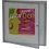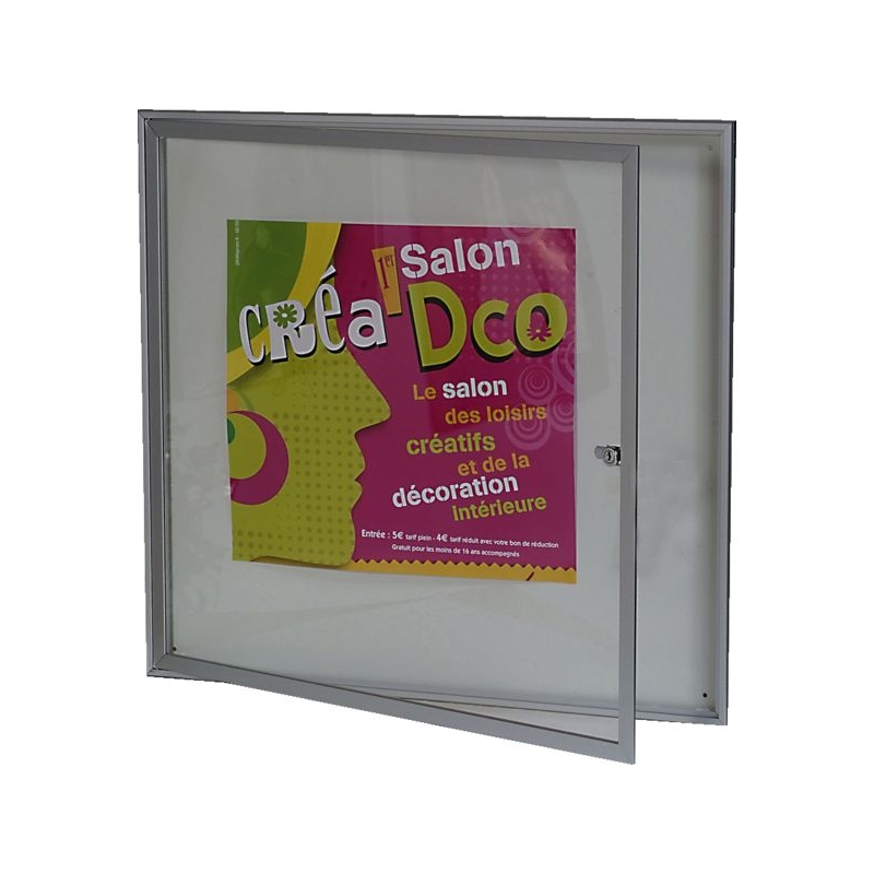 Porte battante, fermeture par serrure à clé avec pose à droite. Profil alu anodisé naturel, façade plexiglas avec entourage à partir du format 6 feuilles. Fond tôle blanc pour affichage magnétique. Fixation murale 4 points. Absence d'entourage de porte pour le format 4 feuilles. Épaisseur hors-tout : 20 mm Épaisseur utile : 12 mm